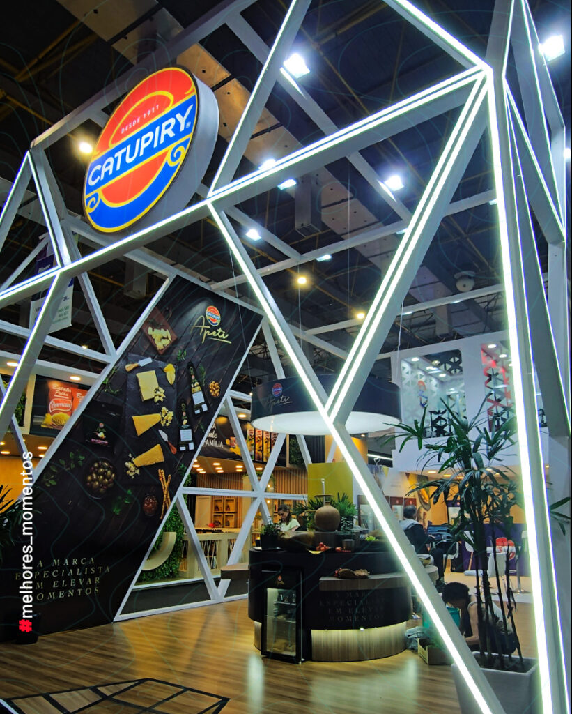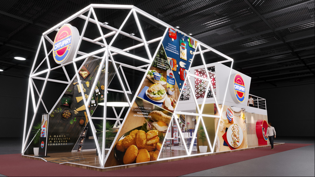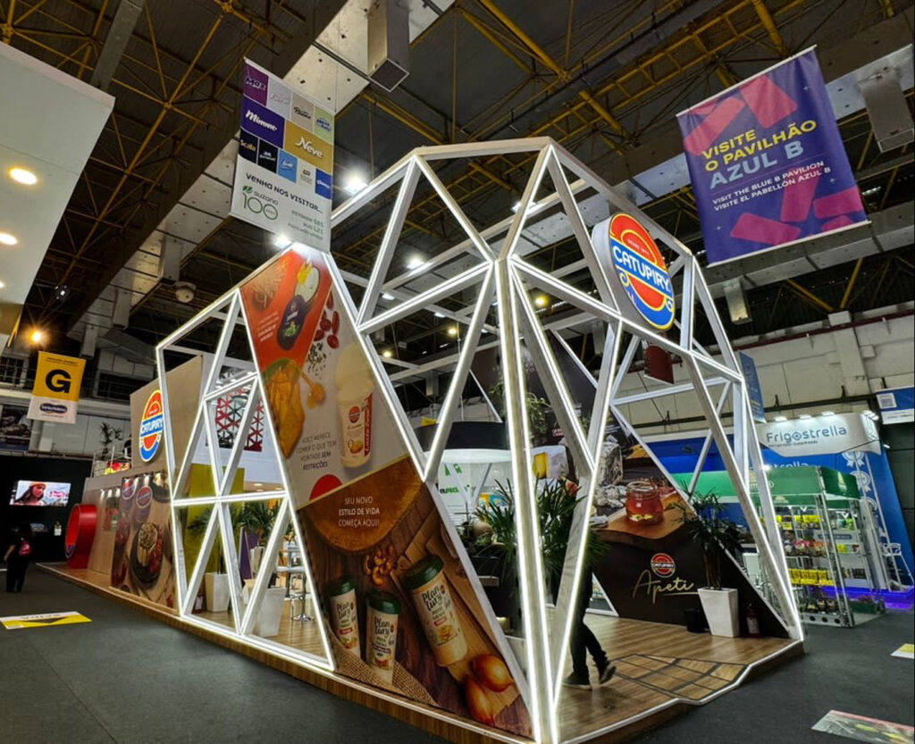 Desenvolvemos uma cenografia com forte apelo visual, baseada em uma estrutura geométrica em LED toda aberta, de forma a convidar os participantes a visitarem o espaço. Painéis fotográficos valorizaram o produto em contexto, enquanto o mezanino virou QG de negócios com conforto e privacidade. Tudo pensado para mostrar que tradição e inovação podem andar juntas.